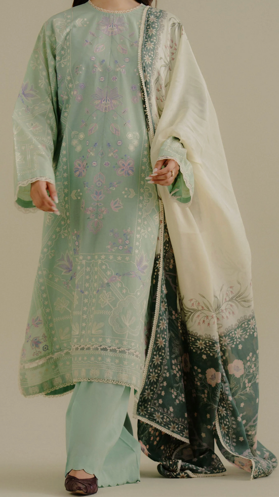 The Mint Green ensemble, paired with a luxurious silk dupatta and composed embroidery, exudes a refined, calming elegance.